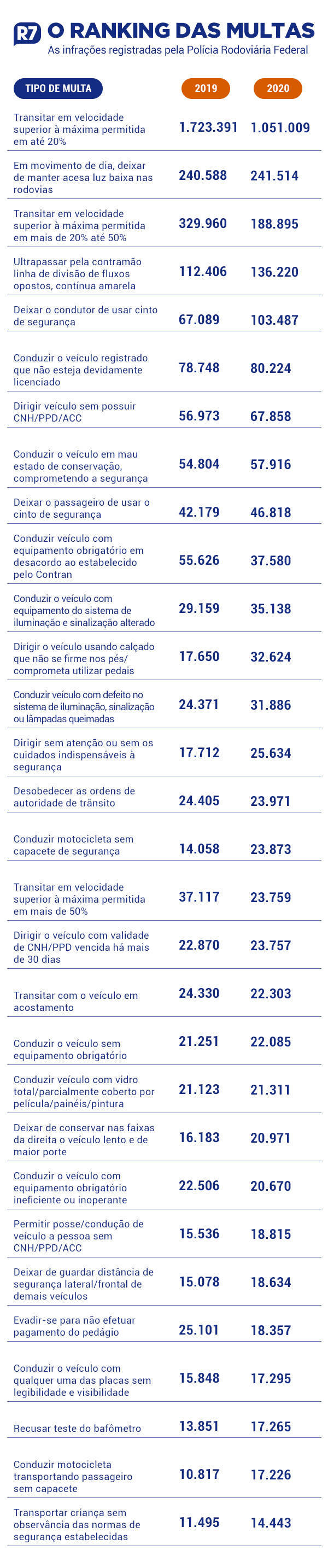 A campeã disparada continua sendo a multa por dirigir com a velocidada superior à máxima permitida em 20%, com 1,05 milhão, média de 240 infrações por hora. Mas também teve uma queda de 39%, considerando o 1,7 milhão registrado no ano passado. Neste caso, a infração é considerada média, com valor de R$ 130,16 e 4 pontos na CNH.